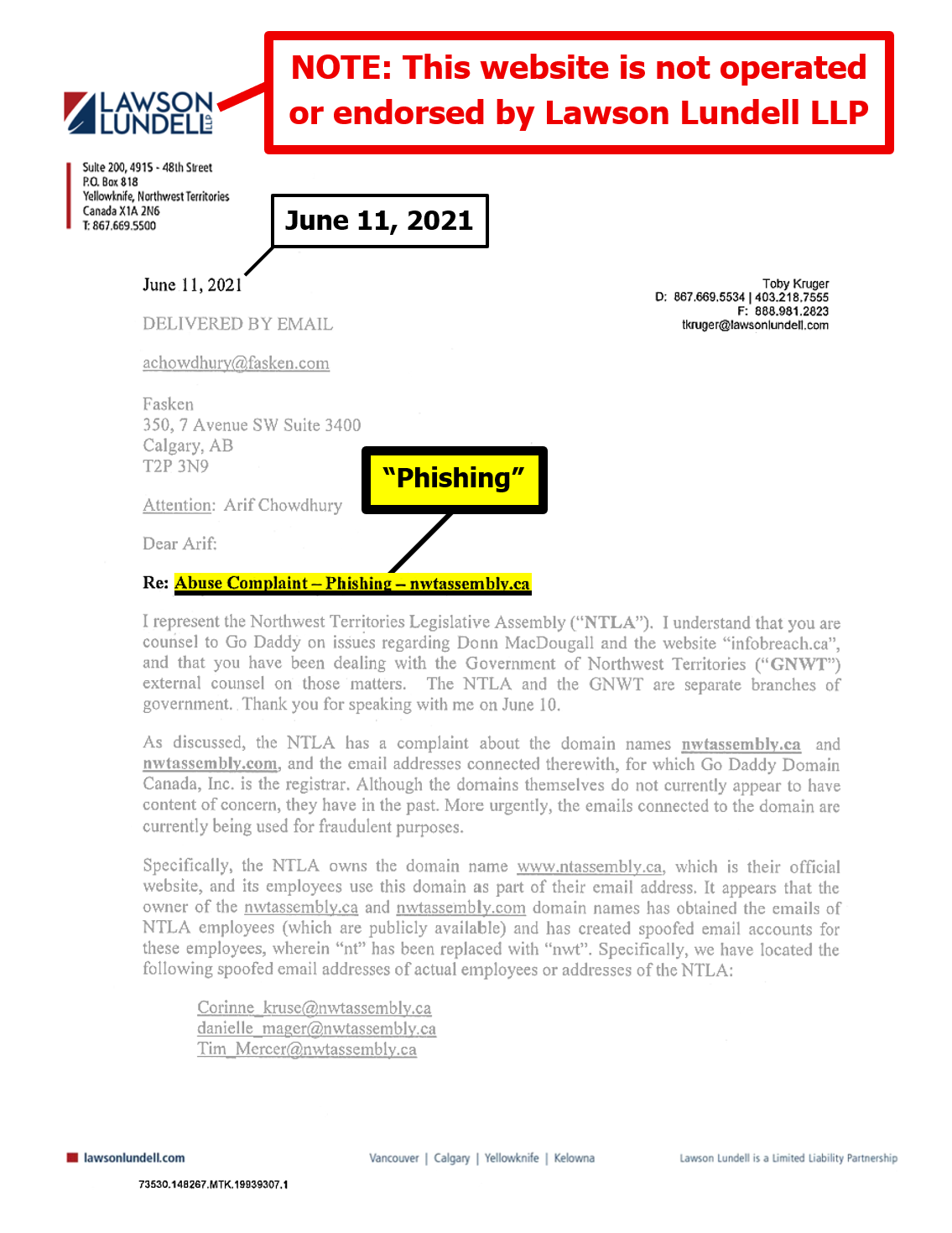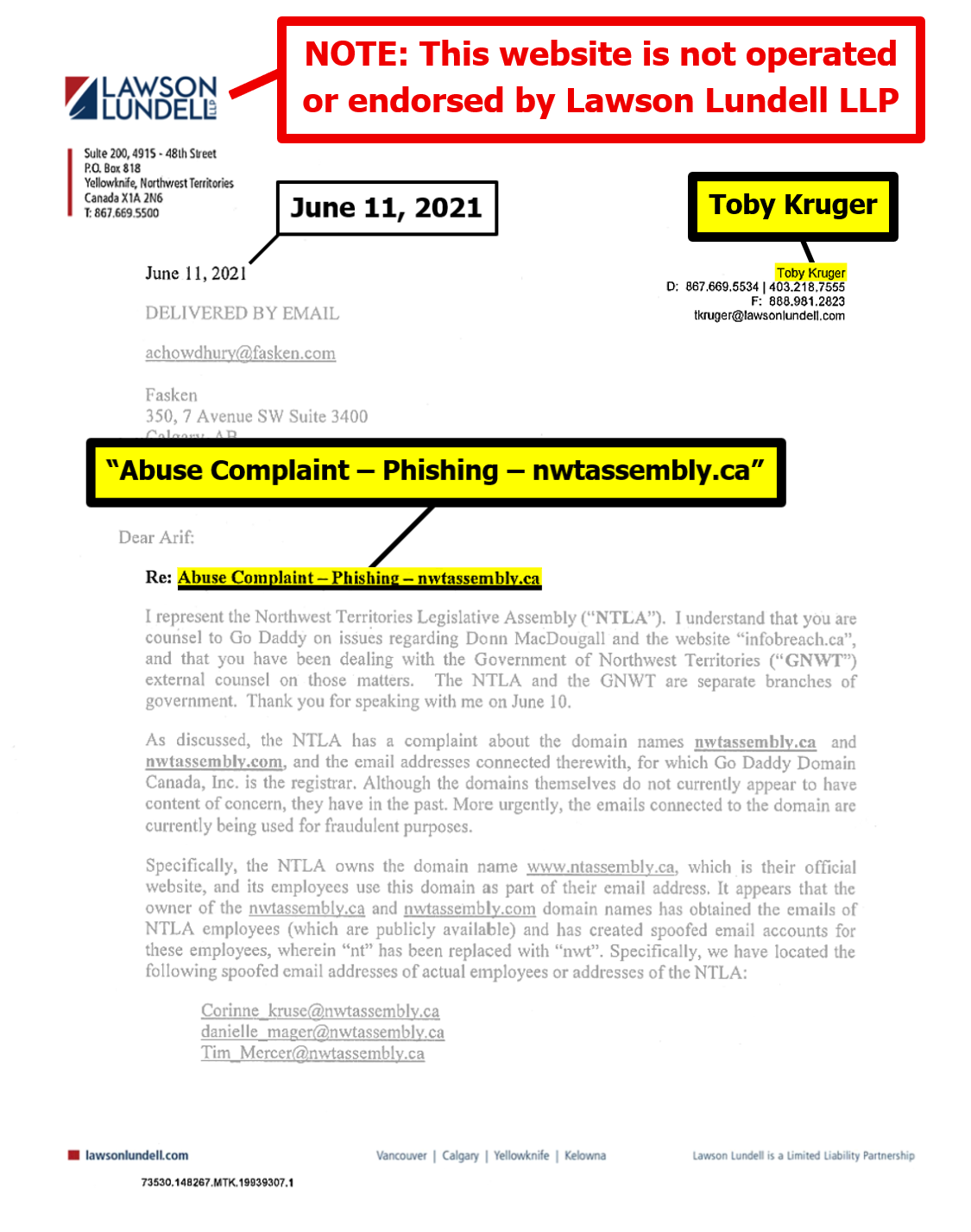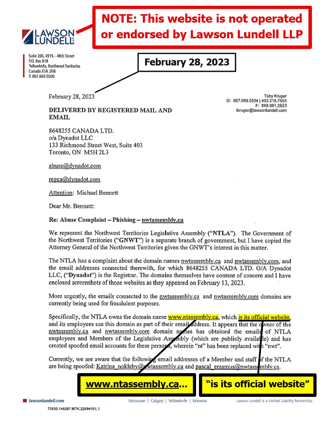 "the NTLA owns the domain name www.ntassembly.ca" is FALSE: